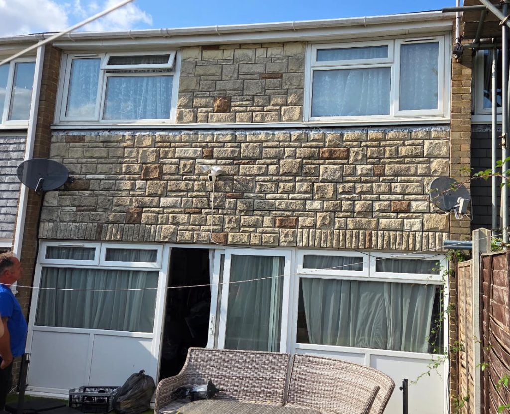 Here’s a real transformation for 60’s fake stone to bang up to date fibre cement cladding!